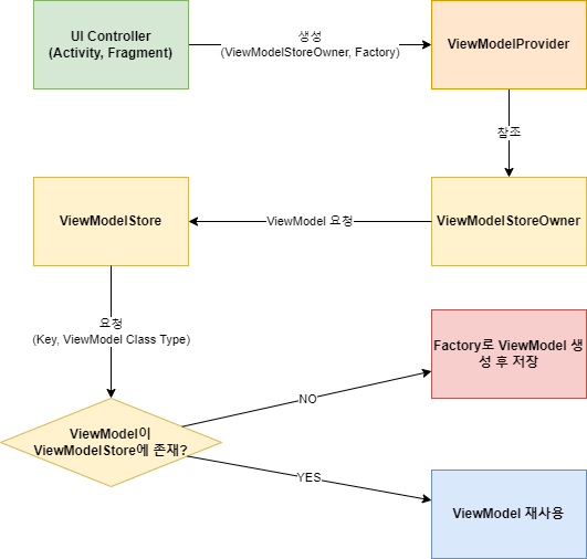 UI Controller(Activity, Fragment)에서 ViewModelProvider를 생성할 때 ViewModelStoreOwner와 Factory를 전달합니다.
