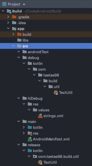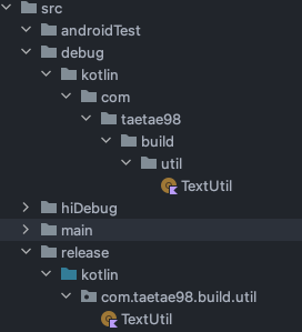 제 예제에서는 buildTypes에 따라 TextUtil의 기능을 분리했습니다. src/debug와 src/release에 TextUtil을 생성합니다. 여기서 주의할 점은 src/main에는 TextUtil을 생성하면 안됩니다. kotlin파일 뿐만 아니라 res, manifest 등 다양한 코드들을 분기할 수 있습니다.