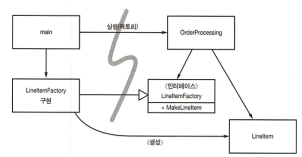 여기서도 마찬가지로 모든 화살표가 main에서 OrderProcessing으로 향하고, OrderProcessing은 LineItem을 생성하는 방법을 모른다. 그럼에도 애플리케이션에서 인스턴스 생성을 완벽하게 통제하며, 애플리케이션에서만 사용하는 생성자 인수를 넘길 수 있다.